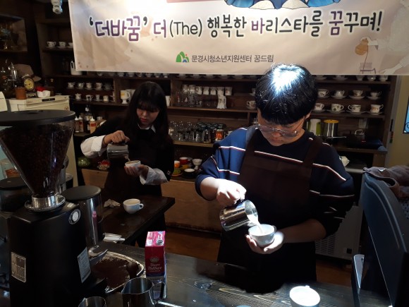 |  | | | ↑↑ 더(The) 행복한 바리스타를 꿈꾸며 | | ⓒ (주)영남도민일보 | | [영남도민일보] 김재근 기자 = 문경시청소년지원센터『꿈드림』은 학교 밖 청소년을 대상으로 바리스타 자격취득 과정인 <더바꿈> 프로그램을 운영하고 12월 11일 자격취득을 위한 실기 시험을 치를 예정이다.