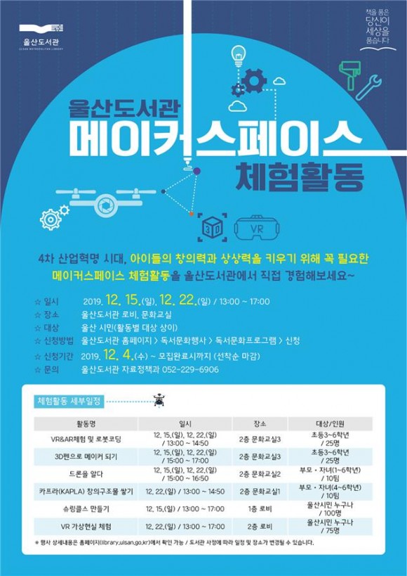 울산도서관 관계자는 “4차 산업혁명 시대, 아이들의 창의력과 상상력을 키우기 위해 꼭 필요한 메이커스페이스 활동에 많은 관심과 참여를 바란다.”며 “앞으로도 창의 역량 강화를 위한 다양한 프로그램을 운영하도록 노력하겠다.”라고 밝혔다.