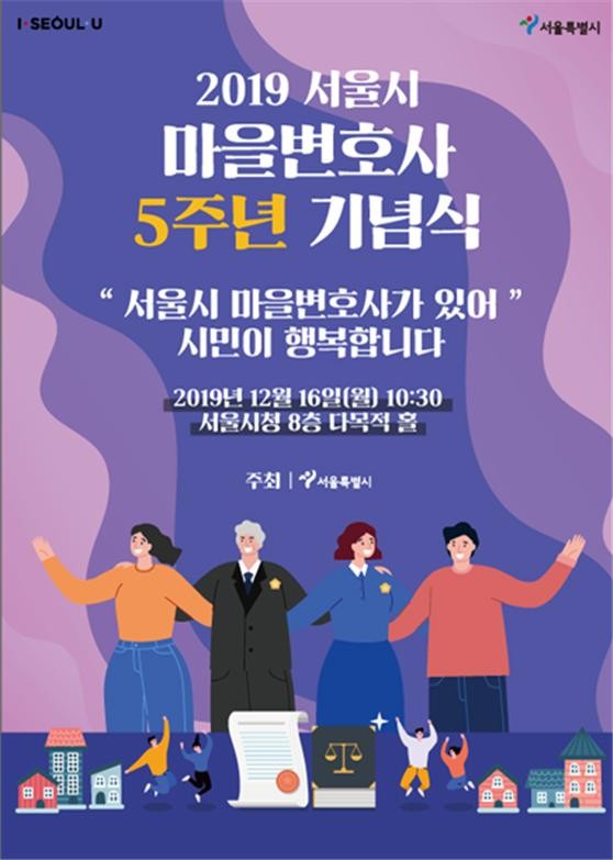 서울시는 마을변호사 시행 5주년을 맞아 16일(월) 오전 10시30분 시청 다목적홀(8층)에서 「서울시 마을변호사 5주년 기념식」을 개최한다고 밝혔다. 마을변호사 제도 정착에 노력한 마을변호사, 자치구 공무원을 대상으로 표창을 수여한다.