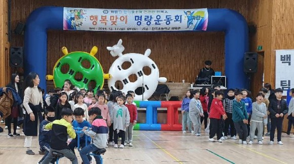 이날 행복맞이 명랑운동회는 청백팀으로 나누어 독도는 우리 땅, 통일 미래로 기차, 지구 나르기, 한마음 탑 쌓기 등 단체 경기를 통해 협동심을 기르고 몸과 마음의 건강을 다졌다. 각 팀의 열띤 응원소리와 함성으로 체육관 뜨거운 열기가 식을 줄 몰랐다.