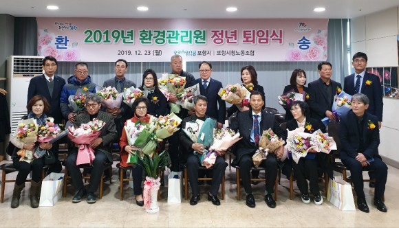 |  | | | ⓒ (주)영남도민일보 | | [영남도민일보] 홍인환 기자 = 포항시는 23일 시청 연오세오실에서 2019년도 환경관리원 정년 퇴임식을 개최해 그동안 쾌적한 도시환경 조성을 위해 봉사·헌신한 퇴임 환경관리원의 노고를 격려했다.