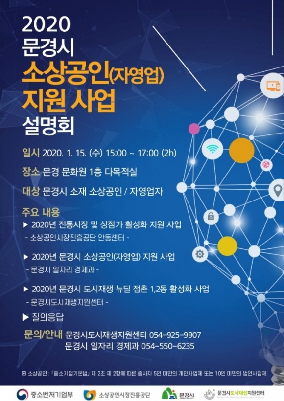 |  | | | ⓒ (주)영남도민일보 | | [영남도민일보] 김재근 기자 = 문경시는 1월15일 오후3시 문경문화원 다목적홀에서 소상공인과 자영업자들을 위한 「2020년도 소상공인(자영업자) 정책지원 사업설명회」를 개최한다.