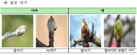 농가는 공급받은 약제를 신초 발아 시(사진 참고)에 살포하고, 약제 방제확인서를 읍면동 농업인상담소에 4월 말까지 제출해야 한다.