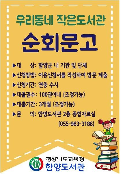 |  | | | ⓒ (주)영남도민일보 | | [영남도민일보] 영남도민일보 기자 = 함양도서관(관장 배향숙)은 시간이나 거리의 제약으로 도서관 방문이 어려운 지역단체 또는 기관을 대상으로 순회문고를 운영한다.
