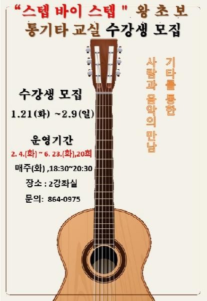 통기타 교실은 오는 2월4일(화) 첫 수업을 시작으로 6월23일(화)까지 매주 화요일 저녁6시30분부터 8시30분까지 총20회로 진행된다.