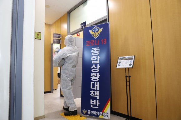 울진해경은 코로나19 위기경보가 심각단계로 격상됨에 따라 지난 24일 부터 종합상황대책반을 격상하여 운영 중이며, 종합상황실, 경비함정, 구조대 등에서 코로나19 방역ㆍ운영대책 등을 수립하여 시행 중이다.