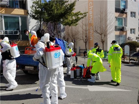 3.14(토) 10:00경 경산시 동부동 남·녀자율방범대 20여명과 함께 동부동 소재 OO아파트 단지 내 합동 방역 소독을 실시하였다.