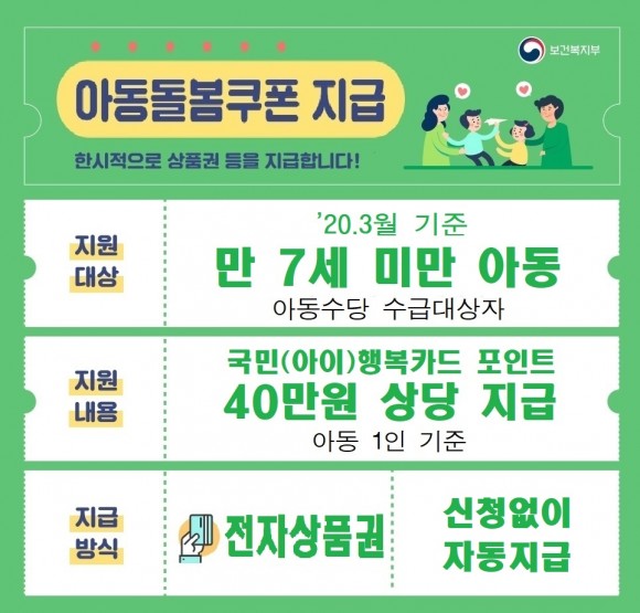 돌봄쿠폰은 아동 보호자 소유의 국민∙아이행복카드로 지급되며, 별도의 신청 없이 13일 일괄 지급된다.