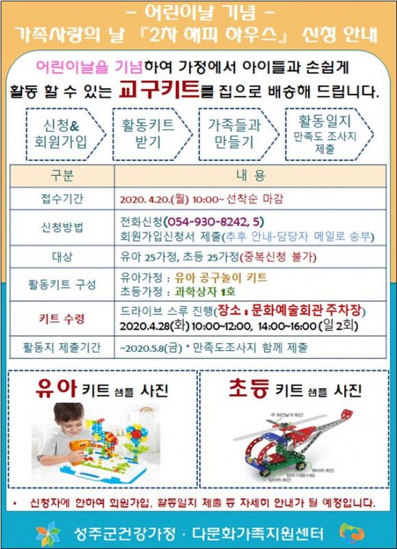 4월 20일(월)부터 선착순 전화 접수를 받으며 활동키트는 문화예술회관 주차장에서 4월 28일(화) 10:00~12:00, 14:00~16:00 2회에 걸쳐서 드라이브 스루 방식으로 전달한다. 대상 가정은 활동 후 일지를 5월 8(금)까지 센터 담당자 이메일(master2230@korea.kr)로 전송하면 된다.