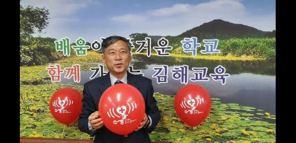 김성철 김해 중부경찰서 서장으로부터 캠페인 참여를 지명받은 조경철 교육장은 이날 풍선 터뜨리기 퍼포먼스와 함께 ‘닥터헬기 소리는 생명의 소리’라는 취지로 사람들의 이해를 구했다.