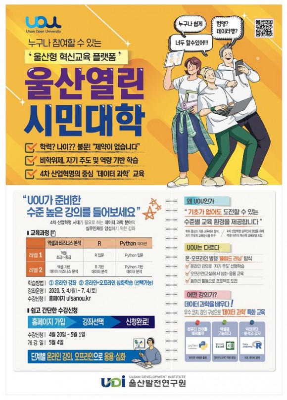 앞서 울산시는 작년 12월부터 올해 2월까지 데이터과학 분야 언어(R, Python)와 데이터 계산 프로그램인 엑셀의 이해와 활용 3개 강좌를 시범운영한 바 있다.