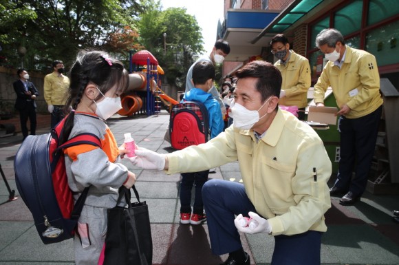 |  | | | ↑↑ 이강덕 포항시장이 아이들에게 손소독제를 나눠주고 있다. | | ⓒ (주)영남도민일보 | | [영남도민일보] 홍인환 기자 = 이강덕 포항시장은 27일, 코로나19로 인해 유치원과 초등학교 1~2학년이 첫 등교함에 따라 이동초등학교와 이동한빛유치원을 찾아 난생 처음 등교하는 새내기 학생들을 축하하고 격려했다.