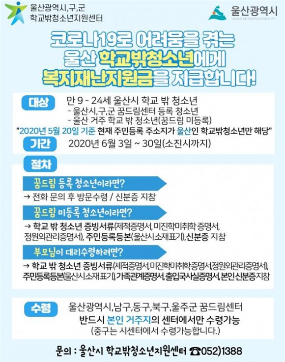 |  | | | ⓒ (주)영남도민일보 | | [영남도민일보] 영남도민일보 기자 = 코로나19로 인하여 어려움을 겪고 있는 울산 거주 학교 밖 청소년 700명에게 6월 3일부터 복지재난지원금이 지원된다.