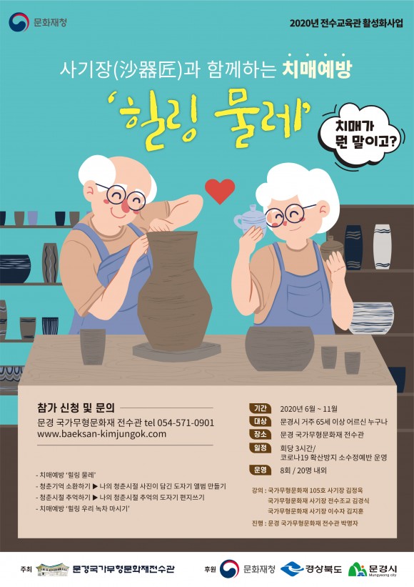 |  | | | ↑↑ 문경 국가무형문화재 전수관, 문화재청 전수교육관 활성화 사업 사기장(沙器匠) 청춘소환 프로젝트 ‘치매예방 힐링물레’ 프로그램 본격 시작 | | ⓒ (주)영남도민일보 | | [영남도민일보] 김재근 기자 = 문경 국가무형문화재 전수관(관장, 영남요 김정옥 사기장)에서 오는 6월 3일부터 사기장 청춘소환 프로젝트 ‘치매예방 힐링물레’ 프로그램을 본격 시작한다.