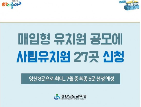 |  | | | ⓒ (주)영남도민일보 | | [영남도민일보] 영남도민일보 기자 = 경상남도교육청(박종훈 교육감)이 사립유치원을 대상으로 진행한 ‘매입형 유치원’ 공모에 27개원이 신청했다고 12일 밝혔다.