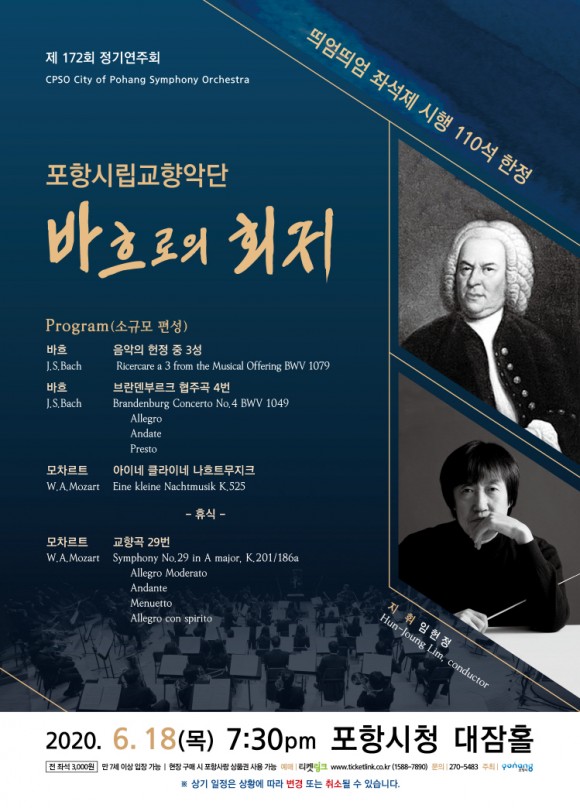 그러나 포항시립교향악단은 생활 속 거리두기 실천이 중요한 상황에서 무대 위에서도 거리두기가 가능한 베토벤 전의 바로크시대, 초기 고전파시대의 소규모 편성 작품들을 선택하였다.