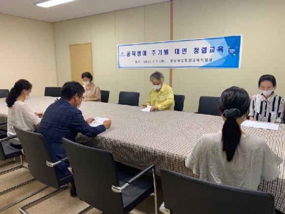 |  | | | ↑↑ 정영환 교육장과 공직생애 주기별 청렴교육에 참석한 직원들의 모습이다. | | ⓒ (주)영남도민일보 | | [영남도민일보] 영남도민일보 기자 = 경상남도밀양교육지원청(교육장 정영환)은 7일 오후에 2층 소회의실에서 이번 7.1.자 인사이동으로 교육지원청에 근무하게 된 직원을 대상으로 공직생애 주기별 대면 청렴교육을 실시하였다.