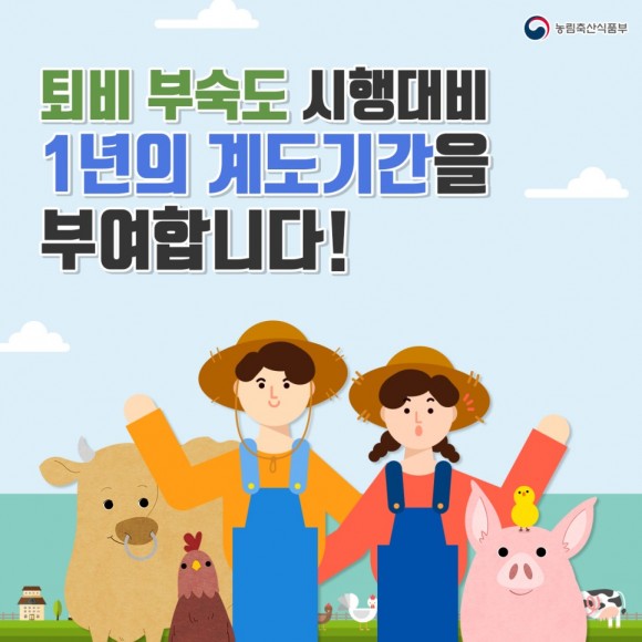 올해 3월 25일부터 퇴비 부숙도 기준이 시행됐지만, 제도 시행일부터 1년간 계도기간을 부여하여 행정처분을 유예한다. 또, 가축분뇨를 1일 300kg 미만으로 배출하는 소규모 농가에 대해서는 검사의무를 제외한다.