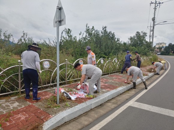 감문면 의용소방대는 도로 경관을 개선하고 운전자 시야 저해로 인한 교통사고 발생을 예방하고자 금회 풀베기 활동을 추진하였으며, 풀베기 작업 후 발생한 잔해 및 주변에 적치된 쓰레기도 모두 수거했다.