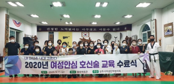 |  | | | ⓒ (주)영남도민일보 | | [영남도민일보] 최교열 기자 = 상주시여성단체협의회(회장 노경순)는 11일 오후 8시 30분 관내 체육관에서 지역 여성 30명을 대상으로 ‘2020 여성안심 호신술 교육’ 수료식을 가졌다.