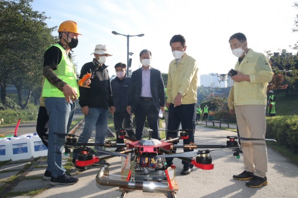 포항드론연구회(박태봉 회장) 회원 7명과 생활방역단 23명 등 60여 명이 참여한 이번 방역은 산책 등으로 자주 찾는 형산강 둔치, 도시철길숲, 냉천 일대 등 10.7ha의 지역에서 진행됐다.