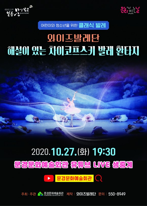 |  | | | ⓒ (주)영남도민일보 | | [영남도민일보] 김재근 기자 = 10월 문화가 있는 날을 맞이해 문경문화예술회관 주최로 “와이즈 발레단 해설이 있는 차이코프스키 발레 환타지”공연을 10월 27일(화) 오후 7시 30분 유튜브로 실시간 중계한다.