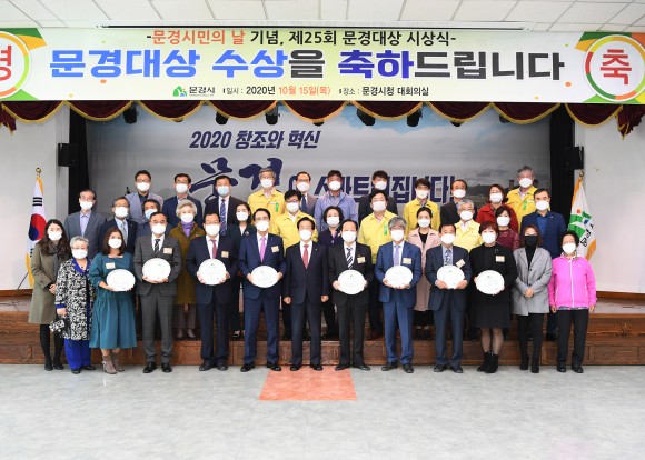|  | | | ⓒ (주)영남도민일보 | | [영남도민일보] 김재근 기자 = 문경시는 문경시민의 날인 10월 15일에 맞춰 제25회 문경시 문경대상 시상식을 개최했다. 문경대상은 매년 문경시민체육대회 및 문화제 개회식에 시상함으로써 많은 문경시민들로부터 축하를 받아왔으나 올해는 문경시민체육대회와 문화제가 취소됨에 따라 문경시청 대회의실에서 수상자의 가족 등 40여명이 참석한 가운데 시상했으며, 코로나19 예방수칙을 철저히 준수해 진행했다.