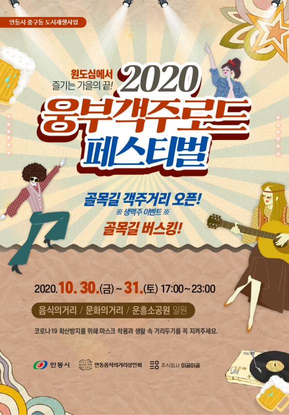 |  | | | ⓒ (주)영남도민일보 | | [영남도민일보] 김 진규 기자 = 안동 원도심 상권 활성화를 위한‘2020 웅부객주거리 로드 페스티벌’및 ‘2020 할로윈파티’가 오는 10월 30일(금)부터 31일(토)까지 이틀간 음식·문화의 거리 일원에서 개최된다.