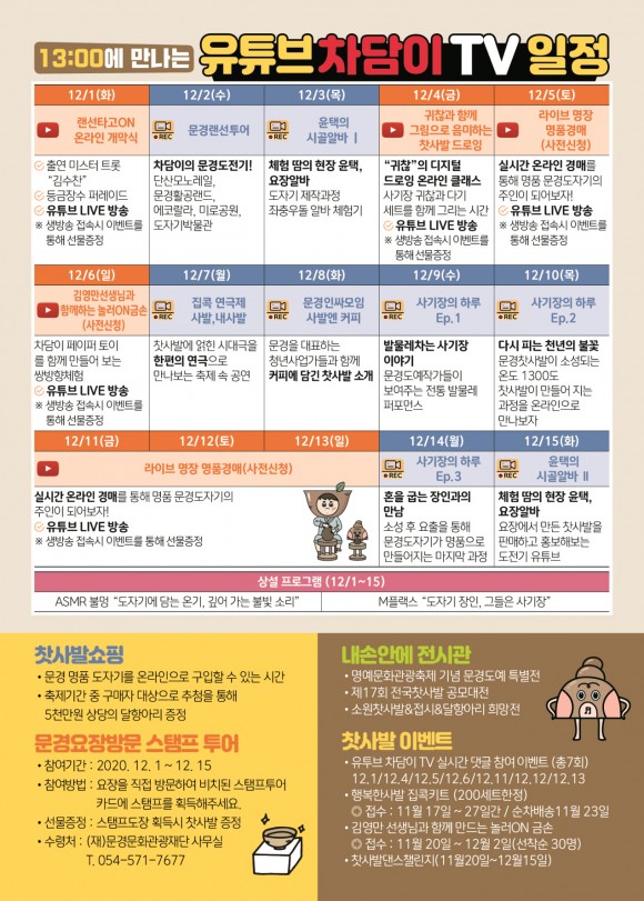 2020 문경찻사발축제는 인터넷 검색창에 ‘문경찻사발축제’를 검색하거나 유튜브 ‘차담이TV’ 검색을 통해 만나볼 수 있다.