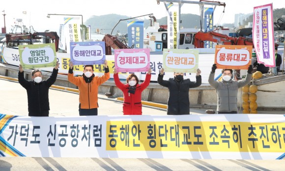|  | | | ↑↑ (왼쪽부터)김희수 경상북도의회 부의장, 이강덕 포항시장, 김정재 국회의원, 김병욱 국회의원, 정해종 포항시의회 의장이 동해안대교 건설기원 퍼포먼스를 하고 있다. | | ⓒ (주)영남도민일보 | | [영남도민일보] 홍인환 기자 = 포항시는 28일 동해안대교 건설을 기원하며 북구 여남방파제에서 남구 임곡항까지 9km에 이르는 ‘동해안대교(영일만횡단구간)’(이하 동해안대교) 사업 구간을 선박으로 횡단했다.