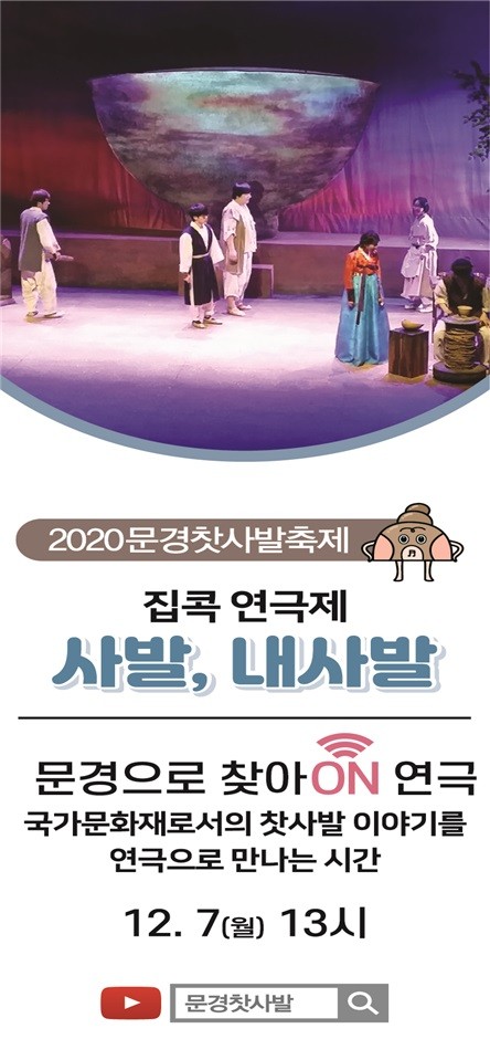 |  | | | ⓒ (주)영남도민일보 | | [영남도민일보] 김재근 기자 = 문경문화관광재단에서는 찻사발을 주제로 기획‧제작한 연극‘사발 내 사발’공연을 오는 7일(월) 13:00 온라인(유튜브 차담이 TV)채널을 통해 제공한다.