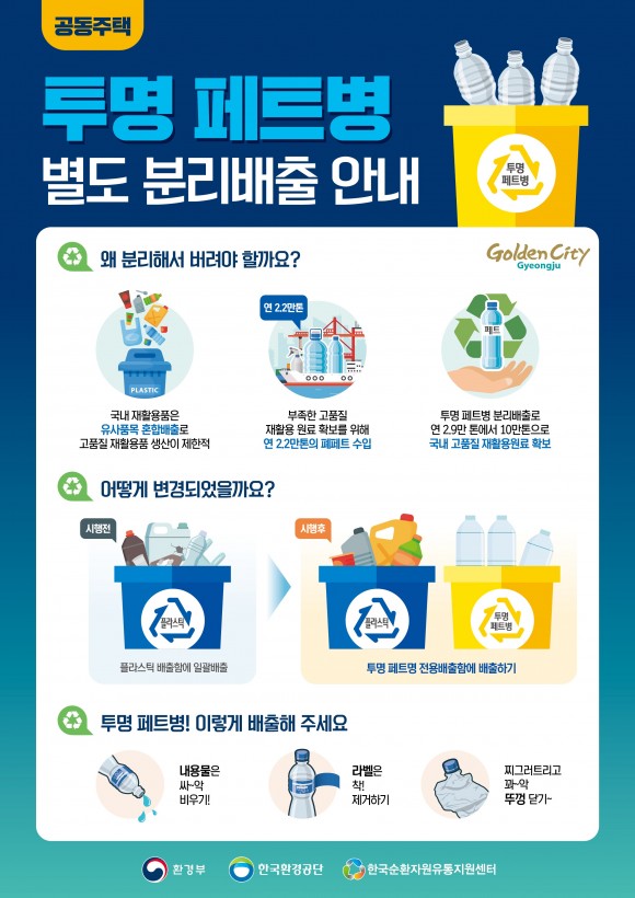 경주시 관계자는 “투명페트병 분리배출이 잘 이뤄질 수 있도록 공동주택 주민들이 분리배출방법을 잘 숙지해 주기를 바란다”고 당부의 말을 전했다.