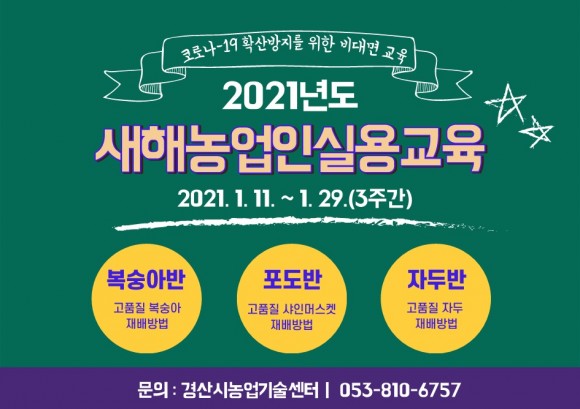 한편, 대면교육이 연기됨에 따라 올해 새해 농업인 실용교육을 위해 미리 제작한 교육 교재는 1월 중순 이후 각 읍면 행정복지센터나 지역농업인상담소를 통해 희망하는 농업인에게 제공할 예정이다.