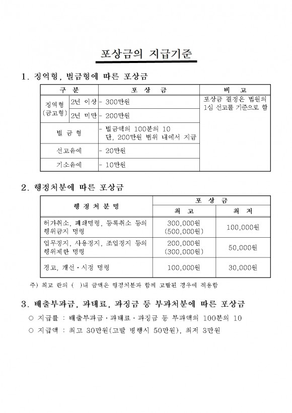 신고포상금은 폐기물관리법을 위반하여 폐기물을 투기·매립·소각하는 행위로 징역형·벌금형·행정처분에 따라 지급되며, 포상금은 법원의 1심 선고를 기준으로 최대 3백만 원까지 지급하며, 가정에서 배출되는 생활폐기물은 신고포상금 지급 대상에서 제외된다.