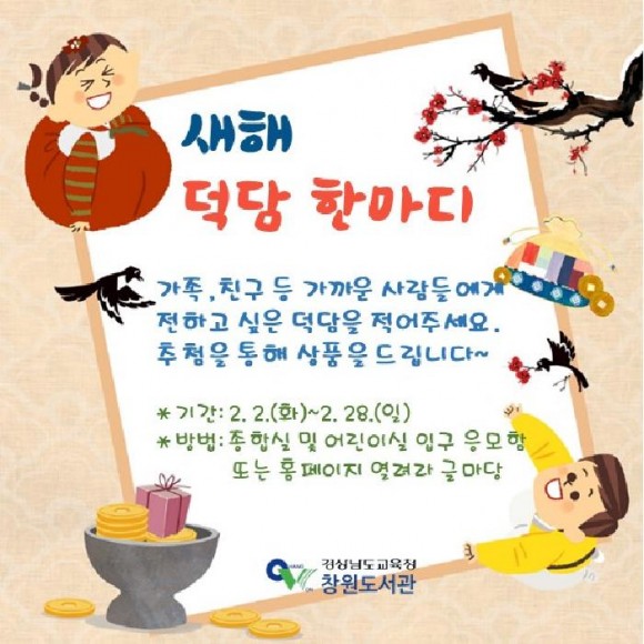 |  | | | ⓒ (주)영남도민일보 | | [영남도민일보] 영남도민일보 기자 = 경상남도교육청 창원도서관(관장 정창모)은 설날과 정월대보름이 있는 2월을 맞아 전통 민속과 관련된 다양한 독서 행사를 운영한다.