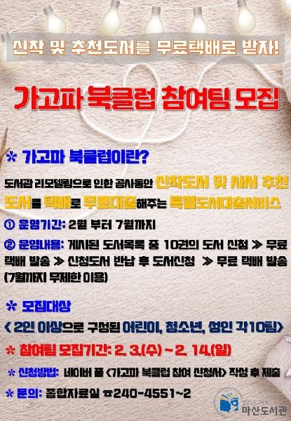 『가고파 북클럽』 행사는 도서관 리모델링으로 인한 공사 동안 새로 들어온 도서 와 사서가 추천하는 책을 택배로 무료대출해주는 특별 도서 대출 서비스이다.