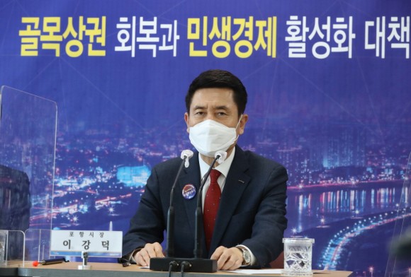 이날 이강덕 포항시장은 지난 해부터 타 지자체보다 강화된 사회적 거리두기 시행에도 불구하고 인터콥 등으로 지역 내 n차(연쇄) 감염이 지속적으로 발생함에 따라 코로나19 강력 대응을 위해 전국 지자체 최초 ‘1세대 1인 코로나19 검사 행정명령’으로 사회·경제적 피해 예방에 선제적인 방역 활동을 전개하여 감염 확산을 차단한 큰 성과를 거두었으며, 후속조치로 비상경제 방역을 위한 ‘민생경제 부활의 경제 대전환 대책’에 총력을 펼친다,