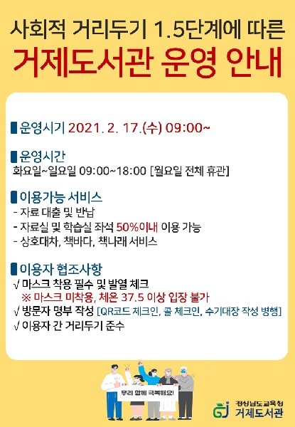 거제도서관 관계자는 “긴 시간 기다려준 이용자들께 감사드리며, 리모델링으로 새롭게 태어난 거제도서관이 영유아부터 청년, 어르신까지 시민 모두가 책을 읽고 즐기는 공간으로 삶의 질을 높이는 플랫폼 역할을 할 수 있기를 기대한다.”고 전했다