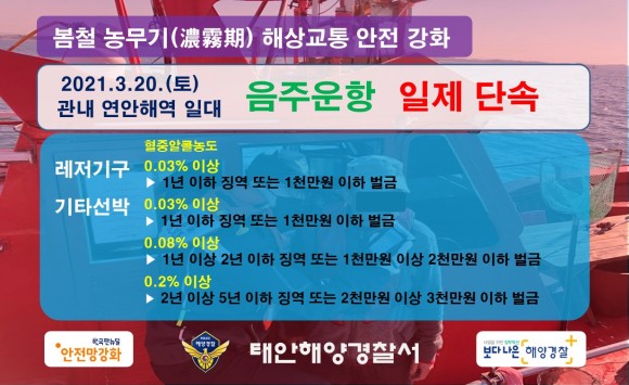 |  | | | ↑↑ 태안해경, 봄철 농무기 해상교통 안전 강화 일환으로 주말인 20일 토요일 연안해역 일대 음주운항 일제단속 예고 / 출처=태안해양경찰서 | | ⓒ (주)영남도민일보 | | [영남도민일보] 영남도민일보 기자 = 충남 태안해양경찰서장(서장 윤태연)는 봄철 농무기(濃霧期) 해상교통 안전관리 강화 일환으로 주말인 20일 토요일 관할 연안해역 일대에서 음주운항 일제단속을 실시한다고 19일 밝혔다.
