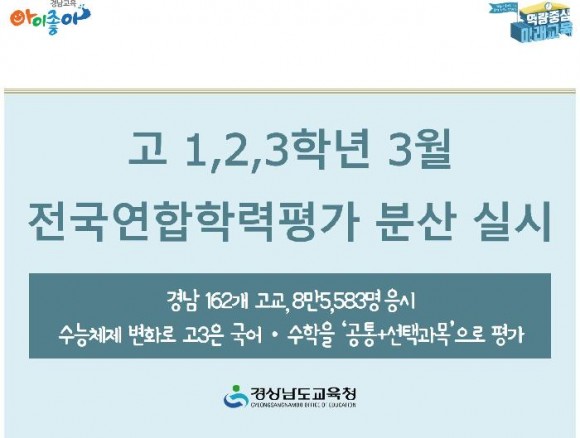 이번 평가에는 경남도내 162개교 1학년 2만7,082명, 2학년 2만8,928명, 3학년 2만9,573명 등 총 8만5,583명이 응시할 예정이며, 전국 1,891개교 고등학생 97만1,128명이 응시한다.