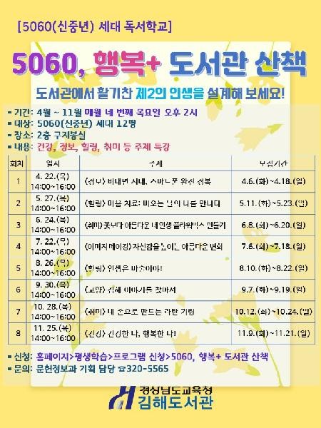 김해도서관이 역점으로 추진하고 있는 5060(신중년) 세대 독서학교 사업의 하나인 「5060, 행복+ 도서관 산책」은 사회에서의 은퇴를 맞이한 5060 세대의 삶에 활력을 더하고, 책과 도서관을 통해 제2의 인생 설계를 지원하기 위해 마련되었다.