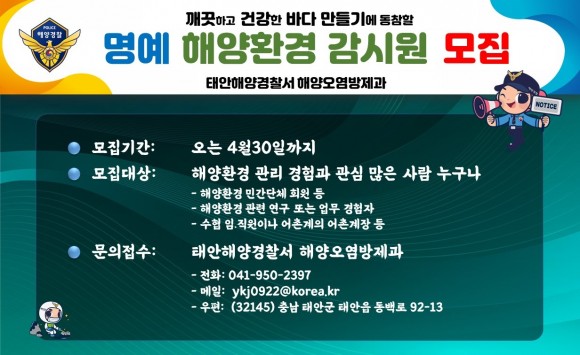 태안해경찰서 유병삼 해양오염방제과장은 “국민참여를 통한 지역 맞춤형 해양오염 예방활동을 강화하고 국민 공감형 청정해역 보전관리 정책추진에 적극 앞장서겠다.”라며, 이번 명예 해양환경 감시원 첫 신규 모집에 많은 관심과 지원을 당부했다.