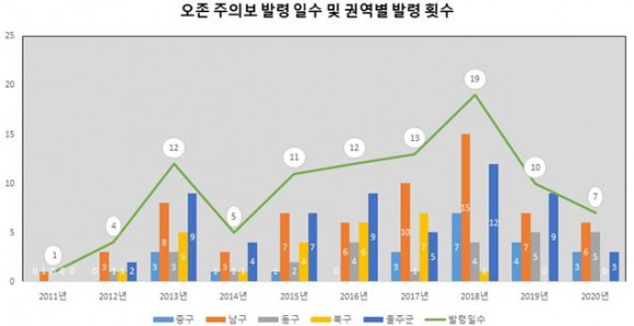 지난해의 경우 울산지역에는 오존 주의보가 7일·17회 발령되었으며, 2018년 19일·39회, 2019년 10일·25회로 매년 감소하고 있다.