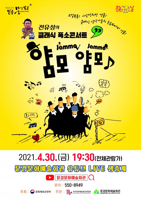 |  | | | ⓒ (주)영남도민일보 | | [영남도민일보] 김재근 기자 = 재미와 웃음이 있는 전유성 연출의 클래식 폭소콘서트“얌모얌모”가 오는 30일 (금)오후 7시 30분 유튜브 '문경문화예술회관'에서 생중계된다.