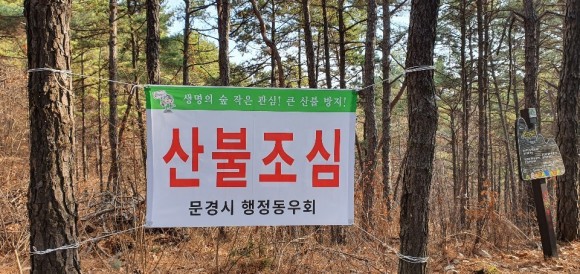 행정동우회는 매년 산불조심 현수막을 제작하여 문경시에 기부하고 있으며, 산불예방활동, 산지정화활동 등 청정문경을 위해 노력하고 있다.
