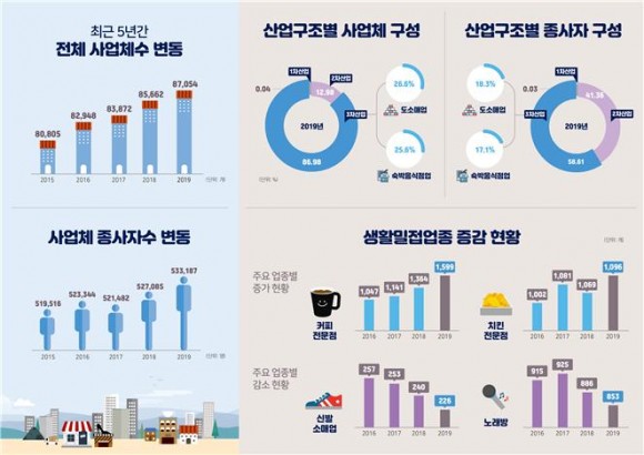 |  | | | ⓒ (주)영남도민일보 | | [영남도민일보] 영남도민일보 기자 = 울산시가 최근 5년간(2015~2019) 지역 내 사업체 현황을 분석한 결과, 숙박·음식업과 서비스업 등 시민 생활 밀접업종을 중심으로 사업체가 꾸준히 증가한 것으로 나타났다. △울산의 사업체* 수는 2019년 기준으로 8만 7,054개였으며, 전년도 대비 1,392개가 늘면서 1.6%의 증가율을 보였다.