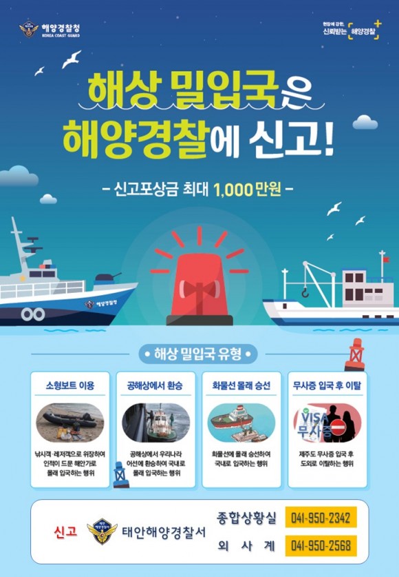 |  | | | ↑↑ ▲태안해양경찰서 밀입국 신고 홍보물 / 출처=태안해양경찰서 | | ⓒ (주)영남도민일보 | | [영남도민일보] 영남도민일보 기자 = 태안해양경찰서는 최근 밀입국, 마약밀수 등 해상을 통한 국제범죄 예방대책 강화 일환으로 최대 1천만원의 포상금을 걸고 주민신고 독려에 나선다.