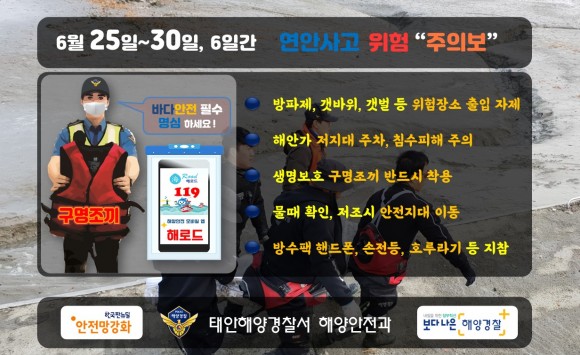 |  | | | ↑↑ ▲연안사고 위험 “주의보” 발령에 따른 안전수칙 알림 ©태안해양경찰서 | | ⓒ (주)영남도민일보 | | [영남도민일보] 영남도민일보 기자 = 태안해양경찰서(서장 성창현)는 6월 25일부터 30일까지 6일간 연안해역 안전사고 위험 ‘주의보’를 발령하고 바다레저 활동에 따른 안전수칙 준수를 당부하고 나섰다.