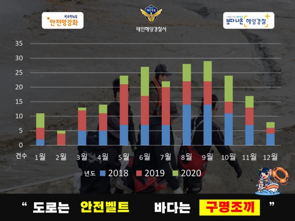 태안해경에 따르면, 지난 3년간 관내 연안사고 전체 222건 가운데 47.7%에 해당하는 106건이 6~9월 여름철에 집중 발생했으며, 같은 기간 사망사건도 전체 20건 중 12건으로 60%로 높게 나타났다.