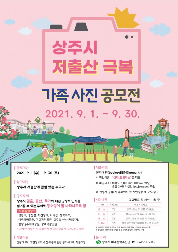 9월 1일부터 9월 30일까지 개최되는 이번 공모전은 결혼, 출산, 육아에 대한 긍정적 인식을 심어줄 수 있는 주제로 지정된 촬영장소(경천대, 경천섬, 학전망대, 나각산, 장각폭포, 삼백테마공원, 경상감영공원, 성주봉 한방산업단지, 함창명주테마공원, 상주곶감공원)에서 촬영한 사진을 접수 받는다.